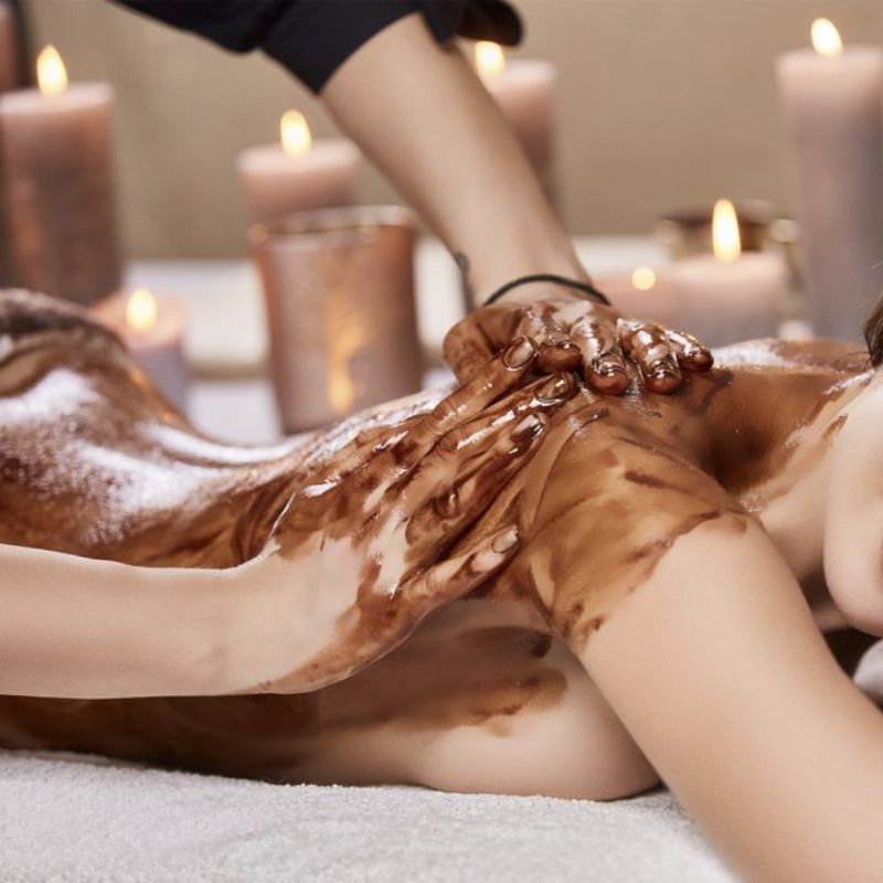 Exfoliant de sucre + embolcall de xocolata + massatge de xocolata i taronja. Exfolia, nodreix i renova la pell.